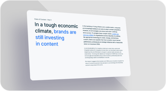State of Content - Part 1 In a tough economic In the backdrop of rising inflation and a volatile market, companies are increasingly having to cut costs in order to remain competitive. However, not all strategies can ensure both short- and long- climate, brands are term success. To navigate these complex waters, content can serve as a lifeline for organizations across industries. By utilizing the appropriate technology to create, manage, and distribute still investing content, teams can expedite their time to market, boost channel performance, and execute on strategic initiatives with a measurable in content return on investment (ROI). A centralized platform for managing content and content data—paired with integrated systems for managing customer data—can help digital market players respond quickly and effectively to changes in customer needs, demands, and expectations. Technology like digital asset management (DAM) helps businesses be more agile and adaptable during a down economy by eliminating team silos and integrating creation and distribution channels. Our research suggests that marketers and CMOs across industries recognize the value of content in uncertain times and plan to use technology that streamlines content to stay ahead of the curve.