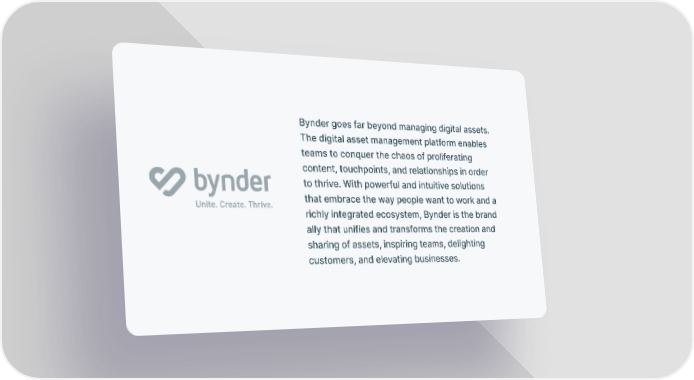 Bynder goes far beyond managing digital assets. The digital asset management platform enables teams to conquer the chaos of proliferating content, touchpoints, and relationships in order to thrive. With powerful and intuitive solutions that embrace the way people want to work and a richly integrated ecosystem, Bynder is the brand ally that unifies and transforms the creation and sharing of assets, inspiring teams, delighting customers, and elevating businesses.