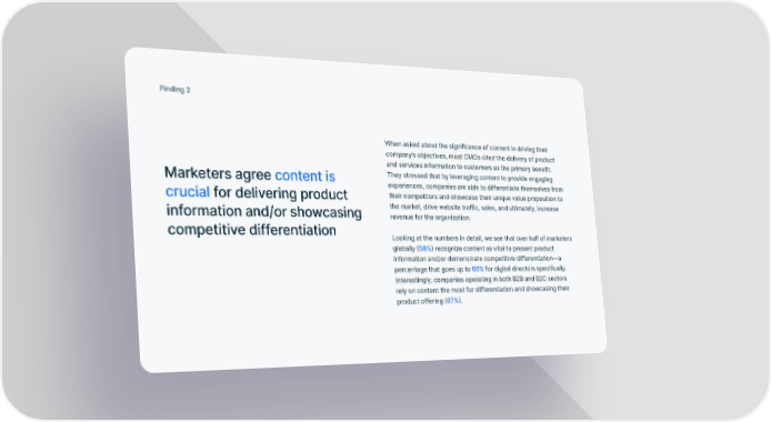 Finding 2 When asked about the significance of content in driving their company’s objectives, most CMOs cited the delivery of product and services information to customers as the primary benefit. Marketers agree content is They stressed that by leveraging content to provide engaging experiences, companies are able to differentiate themselves from crucial for delivering product their competitors and showcase their unique value proposition to information and/or showcasing the market, drive website traffic, sales, and ultimately, increase revenue for the organization. competitive differentiation Looking at the numbers in detail, we see that over half of marketers globally (58%) recognize content as vital to present product information and/or demonstrate competitive differentiation—a percentage that goes up to 66% for digital directors specifically. Interestingly, companies operating in both B2B and B2C sectors rely on content the most for differentiation and showcasing their product offering (67%).