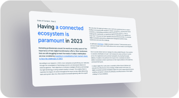 State of Content - Part 2 Not only does this approach reduce costs, but it also accelerates time to market— Having a connected leading to increased profit compared to slower competitors—and promotes brand consistency. Maintaining consistency while distributing content is, in fact, a challenge for most brands, as reported by 66% of respondents who regularly use ecosystem is more than 11 channels for their marketing and promotional activities. A connected digital ecosystem powered by a digital asset management platform helps paramount in 2023 businesses overcome this challenge. As defined by McKinsey, a digital ecosystem consists of “interconnected sets of services through which users fulfill various cross-sectoral needs in one integrated Marketing professionals around the world are acutely aware of the experience.” importance of their digital transformation efforts. Most businesses Such a system allows teams to manage the entire content lifecycle—from creation that are still struggling to meet the needs of today’s marketplace to automatic distribution at scale—and increases the value and flow of content are now considering investing in consolidating their martech stack across the organization and customer touchpoints. By ensuring the proper to face the challenges of 2023. delivery of assets to the platforms that require them, businesses are able to deliver exceptional content experiences to their target audience at the right time, According to our research, in 2023, most companies are prioritizing cost reduction and reach their goals. through the consolidation of technology systems and decreased reliance on In today’s digital-first world, data is essential to inform future initiatives and external agencies. Their objective is to enhance strategic efficiency and leverage evaluate the effectiveness of any strategy. A DAM solution at the heart of a the right technology to bring content creation in-house. This enables them to digital ecosystem provides invaluable insights into asset usage and performance, maximize the impact of content throughout the buyer journey while eliminating enabling companies to elevate the efficiency and effectiveness of their digital team and system silos that often result in increased spending with little payoff. strategy for future initiatives.
