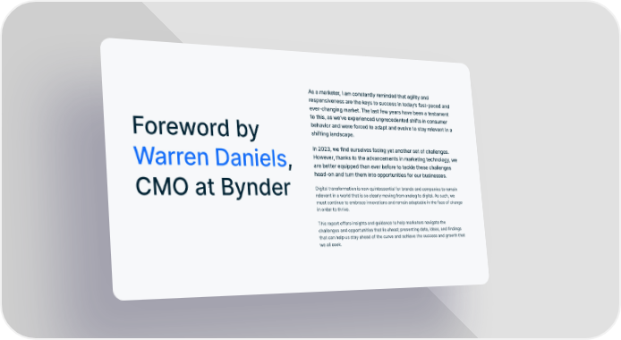 As a marketer, I am constantly reminded that agility and responsiveness are the keys to success in today’s fast-paced and ever-changing market. The last few years have been a testament to this, as we’ve experienced unprecedented shifts in consumer behavior and were forced to adapt and evolve to stay relevant in a Foreword by shifting landscape. In 2023, we find ourselves facing yet another set of challenges. Warren Daniels, However, thanks to the advancements in marketing technology, we are better equipped than ever before to tackle these challenges head-on and turn them into opportunities for our businesses. CMO at Bynder Digital transformation is now quintessential for brands and companies to remain relevant in a world that is so clearly moving from analog to digital. As such, we must continue to embrace innovations and remain adaptable in the face of change in order to thrive. This report offers insights and guidance to help marketers navigate the challenges and opportunities that lie ahead; presenting data, ideas, and findings that can help us stay ahead of the curve and achieve the success and growth that we all seek.