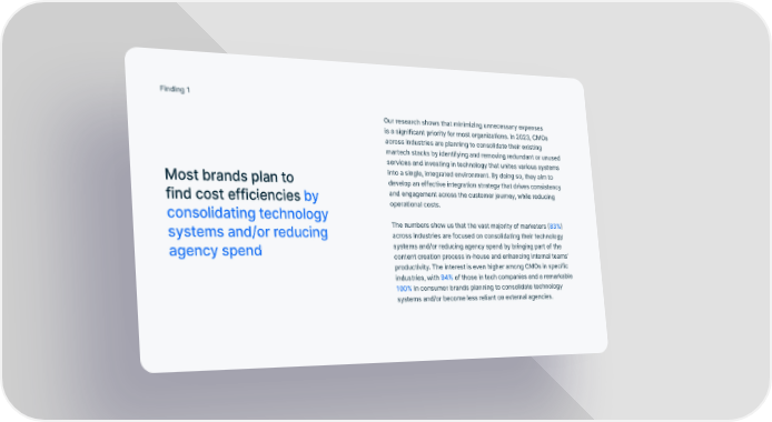 Finding 1 Our research shows that minimizing unnecessary expenses is a significant priority for most organizations. In 2023, CMOs across industries are planning to consolidate their existing martech stacks by identifying and removing redundant or unused services and investing in technology that unites various systems Most brands plan to into a single, integrated environment. By doing so, they aim to develop an effective integration strategy that drives consistency find cost efficiencies by and engagement across the customer journey, while reducing consolidating technology operational costs. systems and/or reducing The numbers show us that the vast majority of marketers (83%) across industries are focused on consolidating their technology agency spend systems and/or reducing agency spend by bringing part of the content creation process in-house and enhancing internal teams’ productivity. The interest is even higher among CMOs in specific industries, with 94% of those in tech companies and a remarkable 100% in consumer brands planning to consolidate technology systems and/or become less reliant on external agencies.