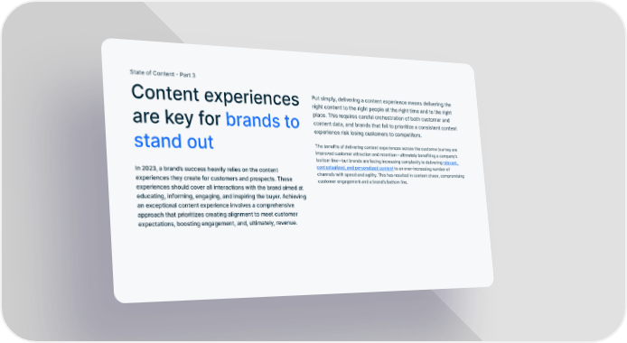 State of Content - Part 3 Content experiences Put simply, delivering a content experience means delivering the right content to the right people at the right time and to the right place. This requires careful orchestration of both customer and are key for brands to content data, and brands that fail to prioritize a consistent content experience risk losing customers to competitors. stand out The benefits of delivering content experiences across the customer journey are improved customer attraction and retention—ultimately benefiting a company’s bottom line—but brands are facing increasing complexity in delivering relevant, In 2023, a brand’s success heavily relies on the content contextualized, and personalized content to an ever-increasing number of experiences they create for customers and prospects. These channels with speed and agility. This has resulted in content chaos, compromising customer engagement and a brand’s bottom line. experiences should cover all interactions with the brand aimed at educating, informing, engaging, and inspiring the buyer. Achieving an exceptional content experience involves a comprehensive approach that prioritizes creating alignment to meet customer expectations, boosting engagement, and, ultimately, revenue.