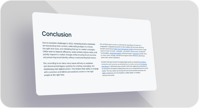 Conclusion Due to economic challenges in 2023, marketing teams worldwide 66% of CMOs plan to invest in a DAM solution operating at the heart of a are reevaluating their content, reallocating budgets to choose composable, integrated ecosystem to drive tangible ROI and boost efficiency. the right tech tools, and rethinking their go-to-market strategies. Bynder’s cloud-based Digital Asset Management (DAM) solution provides a single CMOs want to improve efficiency, scale content, reduce costs, and source of truth for brand-, campaign-, and product-related assets. Its powerful functionalities, integrated modules, and broad range of integrations enable teams quickly respond to market changes while ensuring future success to create, store, manage, and distribute digital content efficiently, delivering a and preserving brand identity without overburdening their teams. world-class content experience. But, according to our data, many teams still rely on outdated Bynder’s DAM goes beyond managing digital assets by streamlining workflows, and disconnected legacy systems for creating, managing, and saving time and resources, accelerating time-to-market, and boosting webpage load speeds. It effectively allows brands to shift their application architecture to distributing their digital content. This hinders their ability to engage an ecosystem of modular building blocks that can be composed based on current with customers and deliver personalized content to the right needs. This way, teams can increase ROI and create business processes and people at the right time. digital experiences with the flexibility to adapt rapidly to changing contexts and needs.