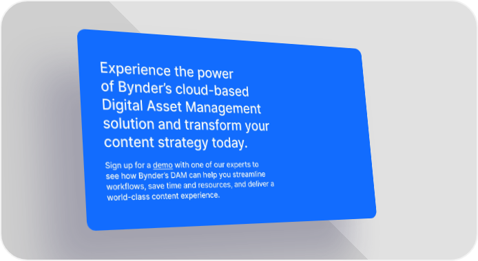 Experience the power of Bynder’s cloud-based Digital Asset Management solution and transform your content strategy today. Sign up for a demo with one of our experts to see how Bynder’s DAM can help you streamline workflows, save time and resources, and deliver a world-class content experience.